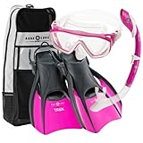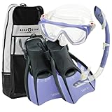 This Aqua Lung snorkeling set is perfect for woman looking to start out on their first snorkeling adventure and advanced enough for those who have been snorkeling already and are looking for a quality snorkeling set. We’ve found that the fits are true and that each every part does what it’s supposed to do: the mask seals on the face, the dry snorkel keeps the water out of the tube whether above the water or submersed, the trek fins pack nicely and are very versatile, and the carry bag holds the entire set plus some sunscreen, camera, and a rolled towel.